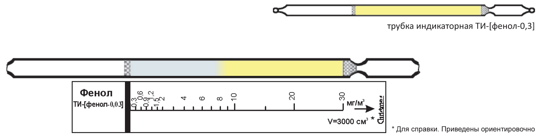 Назначение: контроль фенола в воздухе рабочей зоны, контроль при аварийных ситуациях в диапазоне от 0,3 до 30 мг/м3.