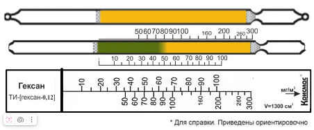 Дополнительная информация: индикаторная трубка калибрована по гексану. Класс опасности гексана – IV. Значение ПДКврз для гексана – 100 мг/м3.