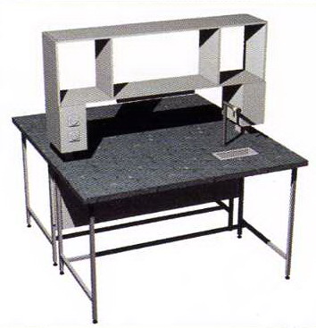 На рабочую поверхность установлен технологический стеллаж с полкой, электрическими розетками, выключателем и люминесцентной лампой.