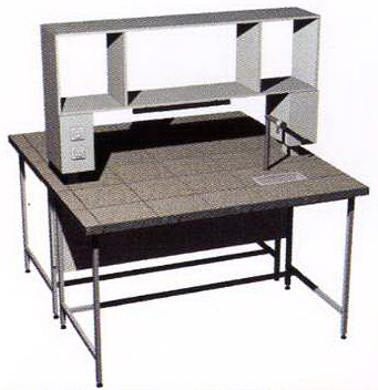 На рабочую поверхность установлен технологический стеллаж с полкой, электрическими розетками, выключателем и люминесцентной лампой.