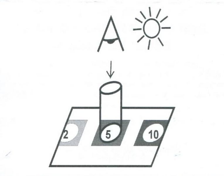 При проведении анализа необходимо сравнить окраску раствора с цветовой шкалой. Окраску раствора необходимо наблюдать сверху через открытое отверстие флакона при достаточном освещении, помещая флакон на белые круги внутри цветных квадратов.