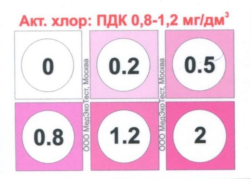 Сравнить окраску раствора с цветовой шкалой и определить концентрацию общего активного хлора.