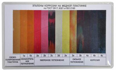 представляют собой цветную эталонную шкалу, воспроизводящую внешний вид медной пластины, подвергнутой коррозионному воздействию нефтепродуктов различной степени агрессивности.