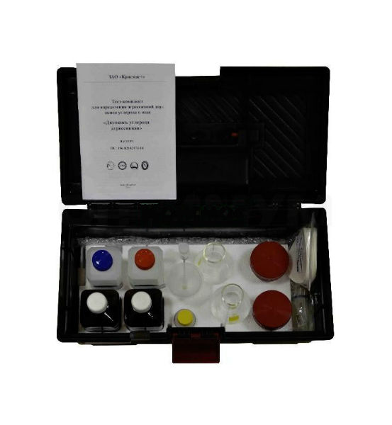 Тест-комплект «Двуокись углерода агрессивная» представляет собой удобный для переноски, транспортирования и хранения жесткий корпус-укладку, в который компактно размещены необходимые средства измерения, готовые растворы и реагенты, посуда и оборудование, документация. Тест-комплект максимально прост и удобен в использовании, позволяет при минимальных затратах осуществлять экспресс-определения массовой концентрации агрессивной двуокиси углерода в природной воде.