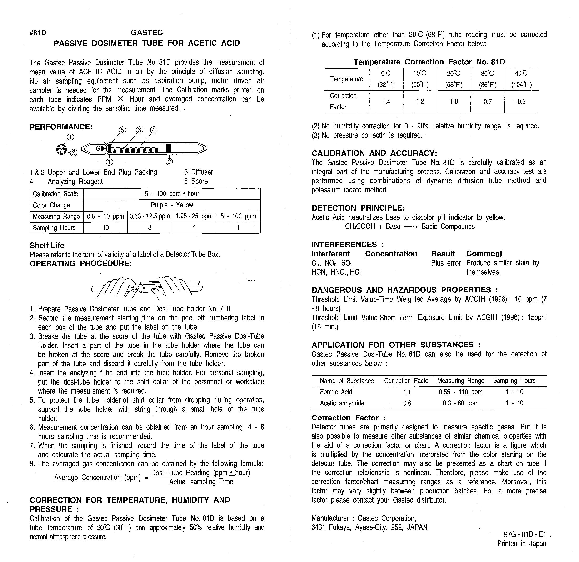Инструкция по применению индикаторных трубок GASTEC № 81D для определения уксусной кислоты