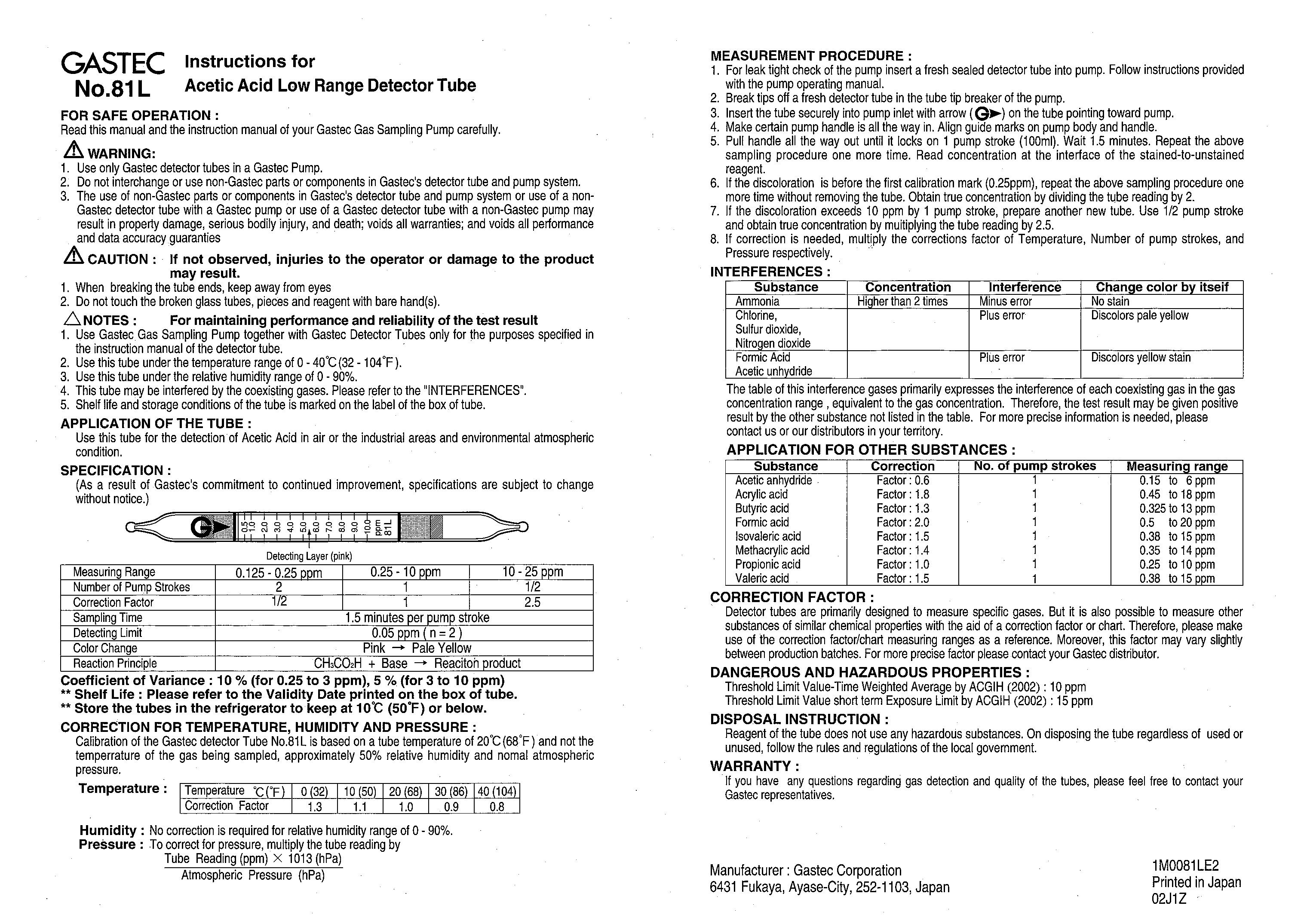 Инструкция по применению индикаторных трубок GASTEC № 81L для определения уксусной кислоты